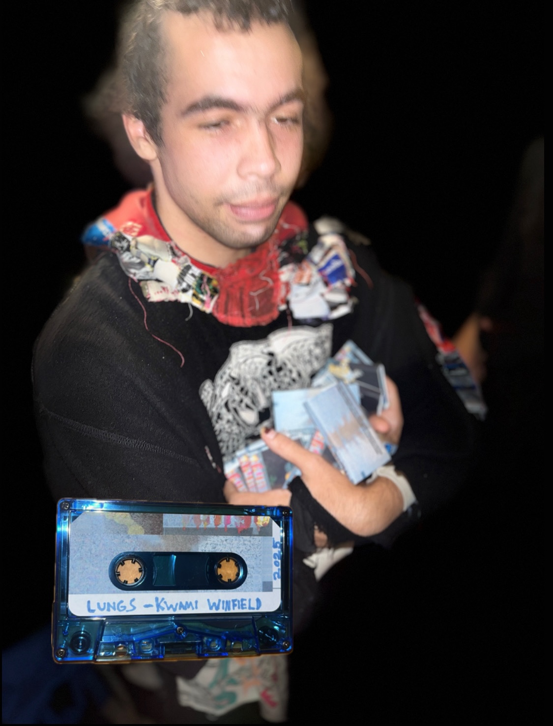 Kwami's commitment is purely to un-ending exploration. Scratching, roaring, ringing, grasping, the feeling of multitudes. with no need for permission nor forgiveness, Winfield can hold a room of familiar faces and remind us how we r all strangers and we are all the same unknowing explorer, trying to define, only to take a life built, & know when its time to tear apart and rebuild without disregard to the materials ever shifting through her hands. There is a secret trust required in the invisible skills carried with us when we arrive empty handed on her planet. We journey a way only she could ever lead, free of defined teathers, wraught with layers that move us from our present location by stretching the horizon. Eventually we find ourselves dropped off back at home, awakened as if from a dream. We look back as conscious beings & try to articulate at, even visualise the whole life we existed as only moments before, only to find it is near impossible to speak aloud the language of dreams. I hold my copy of LUNGS. the inaccessible forbidden language, somehow in my hands, held together with magnetic tape and plastic.